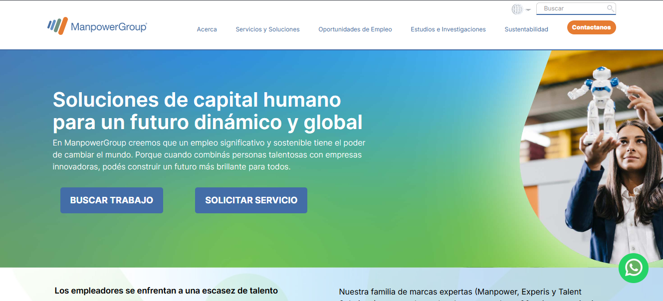 También encontrás servicios de desarrollo organizacional, outsourcing, intermediación y payrolling en caso de que lo necesites. Una web, 70 años y más de 50.000 profesionales registrados.