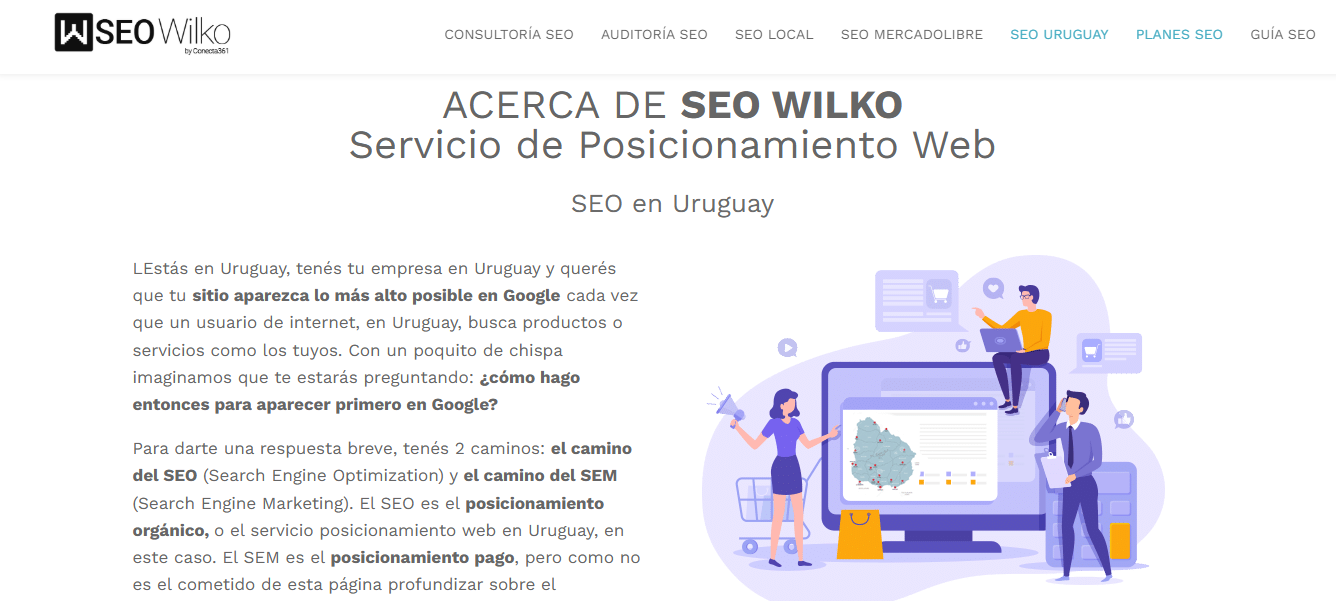 SEO Wilko nace en Uruguay y brinda servicios exclusivamente de SEO. Es una joya si te interesa la temática, realmente. Cabe destacar que cuentan con 15 años de experiencia, siendo un spin-off de Conecta 361.